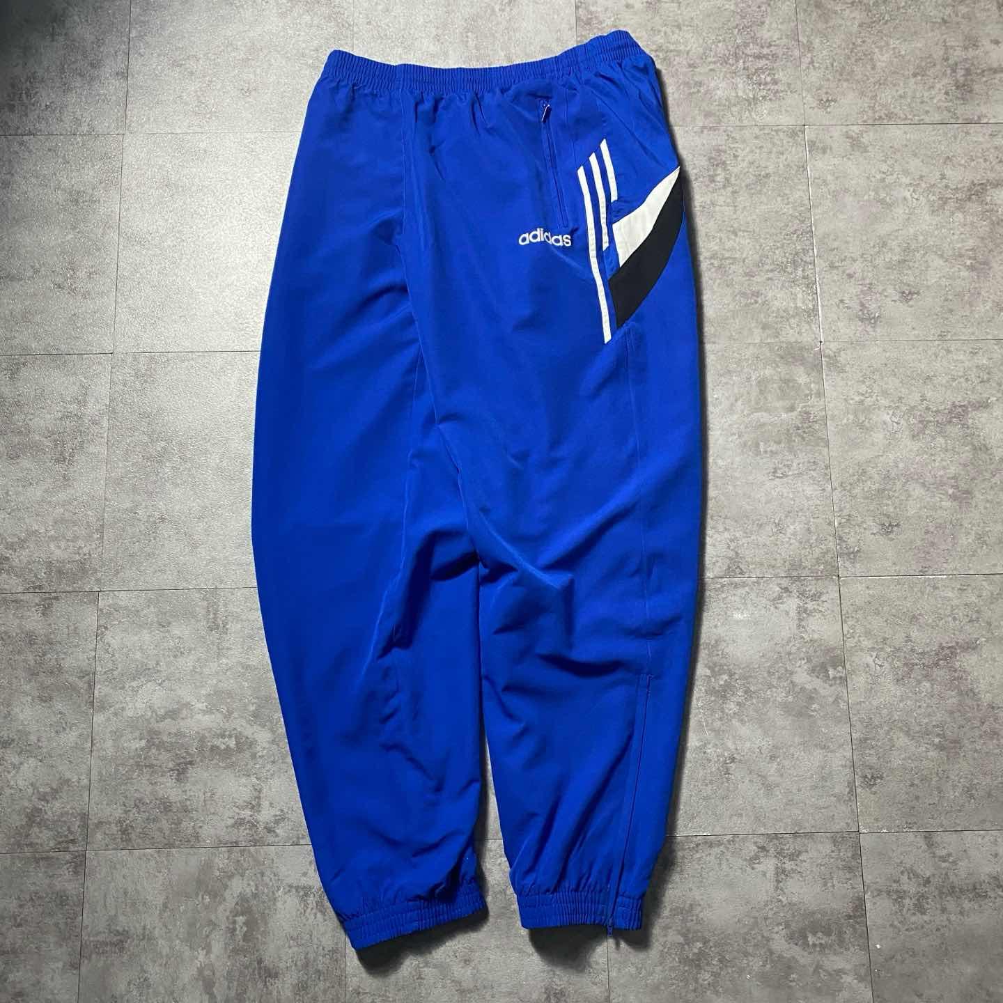 90s アディダス 刺繍ロゴ ジップ付ポケット ブルー ナイロン トラックパンツ