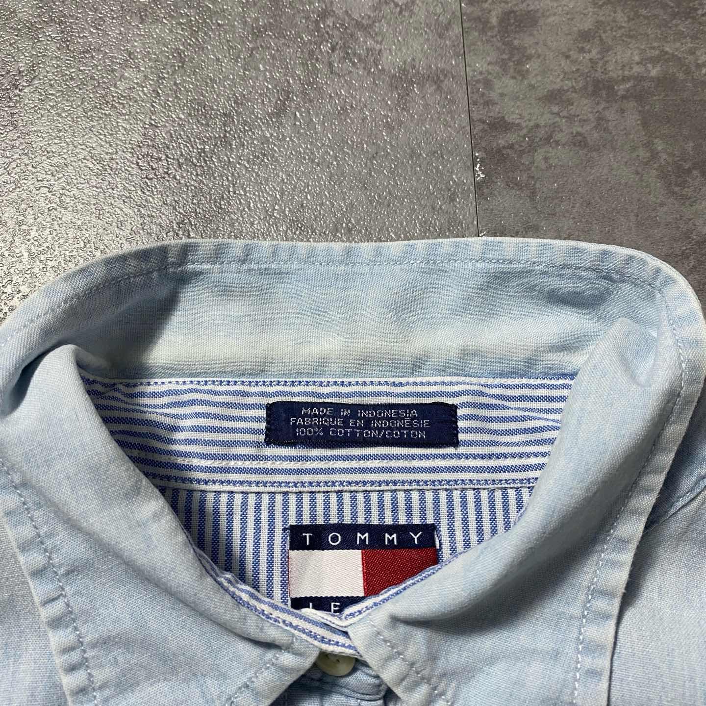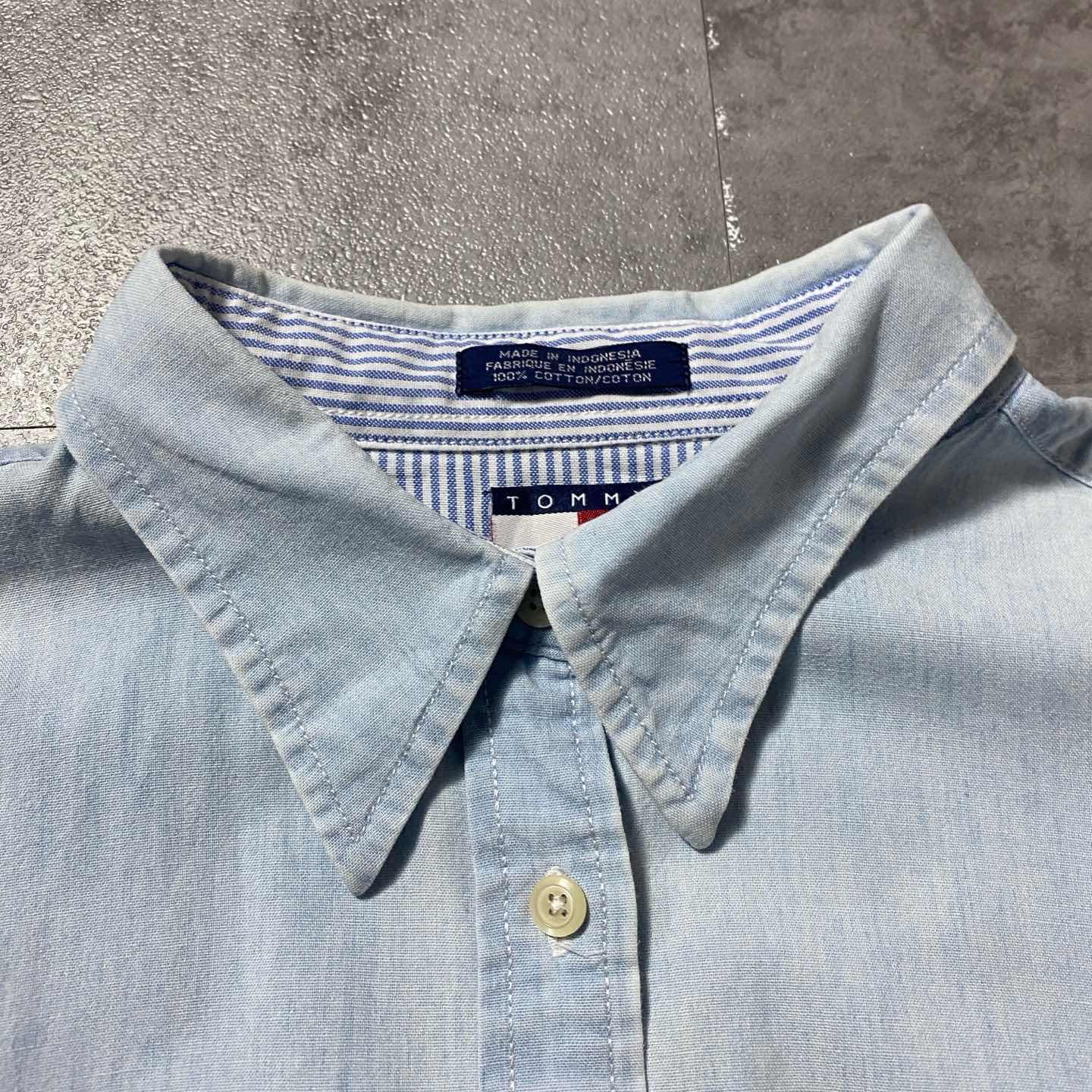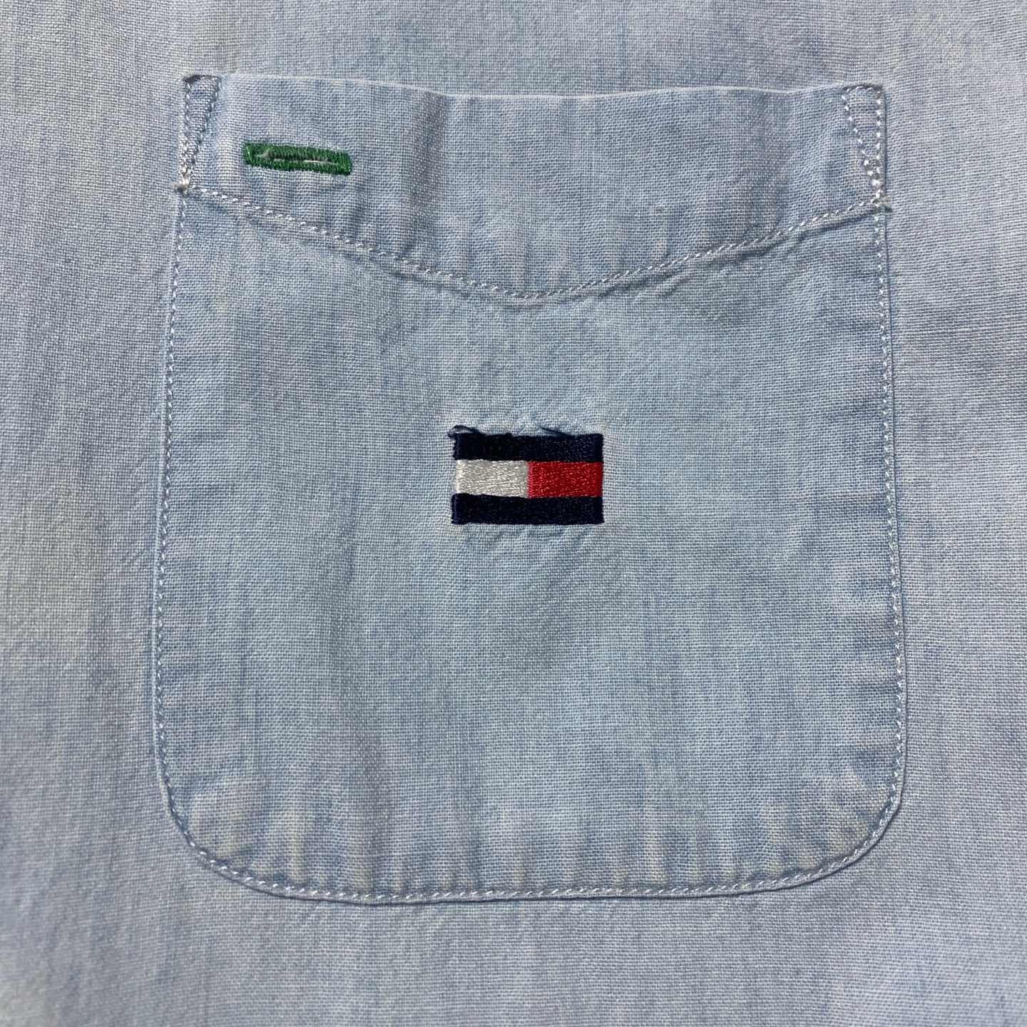 90s トミージーンズ 刺繍フラッグロゴ 胸ポケット 薄紺 デニムシャツ