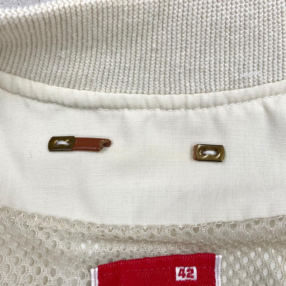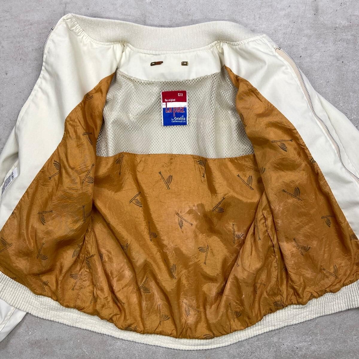 ■70年代 La Paz by Catalina トビウオ柄 カップショルダー ダービージャケット メンズM相当 古着 70s ヴィンテージ VINTAGE アメカジ 総柄ライナー クリームベージュ【P2603】【ブルゾン・ジャケット】/ベージュ 【ブランド】La Paz by Catalina 【サイズ】表記 42(実寸メンズM相当) ※計測値をご確認ください。 着丈…64.5 身幅…59 裄丈…81.5 袖丈(脇下計測)…50 【生産国】不明 【素材】不明(おそらくコットン) 【状態】裏側レザー部分に破損があります。 多少の毛羽立ちがありますが、目立ったダメージや汚れはなく、まだまだ愛用していただけます。 画像にてご確認ください。 【j260319106】 ※古着は洗濯、検品などのケアを行っております。(新品・デッドストックは洗濯していません。) ※モニターの発色により実物と異なる場合がございます。予めご了承ください。 ※ 海外直輸入USED品になります。