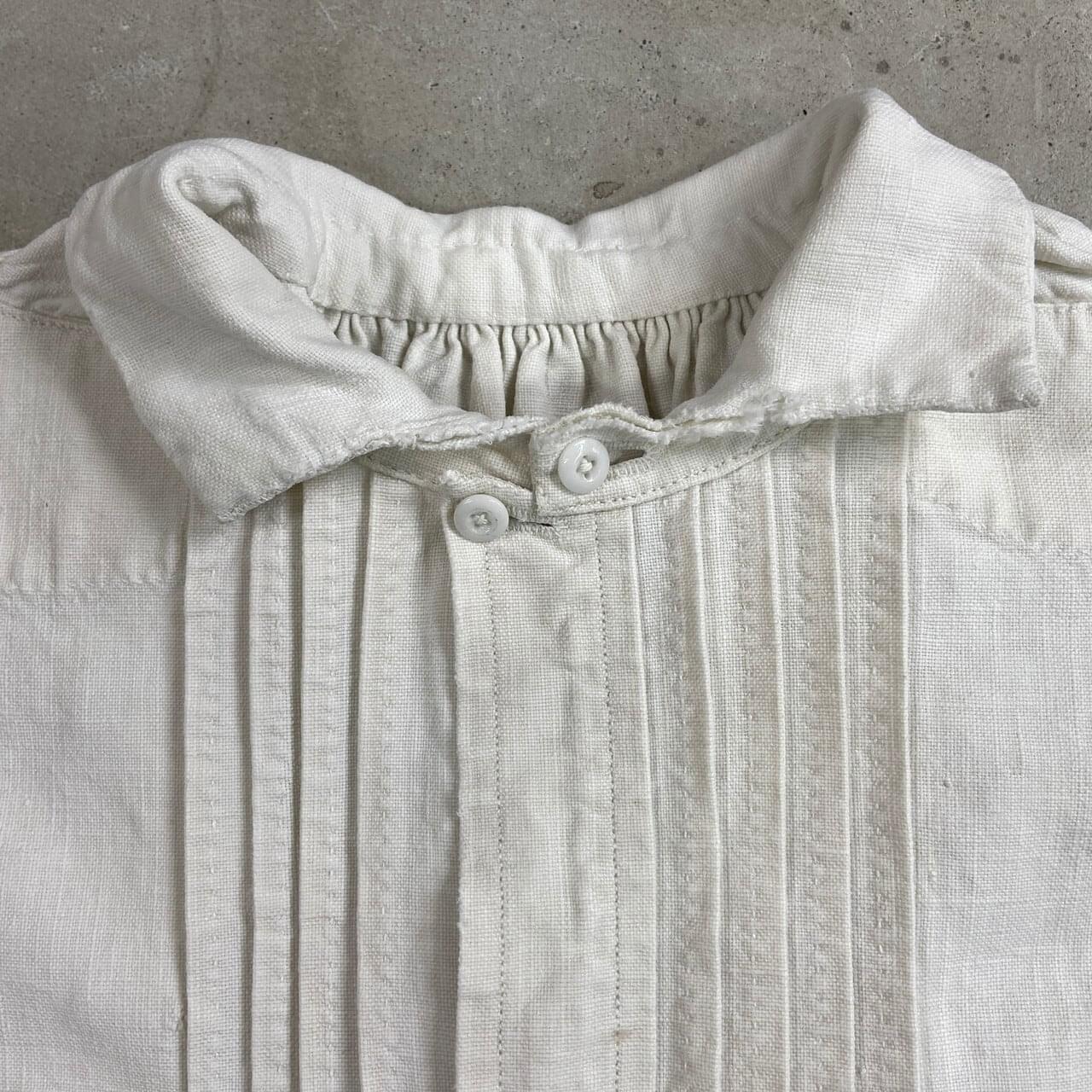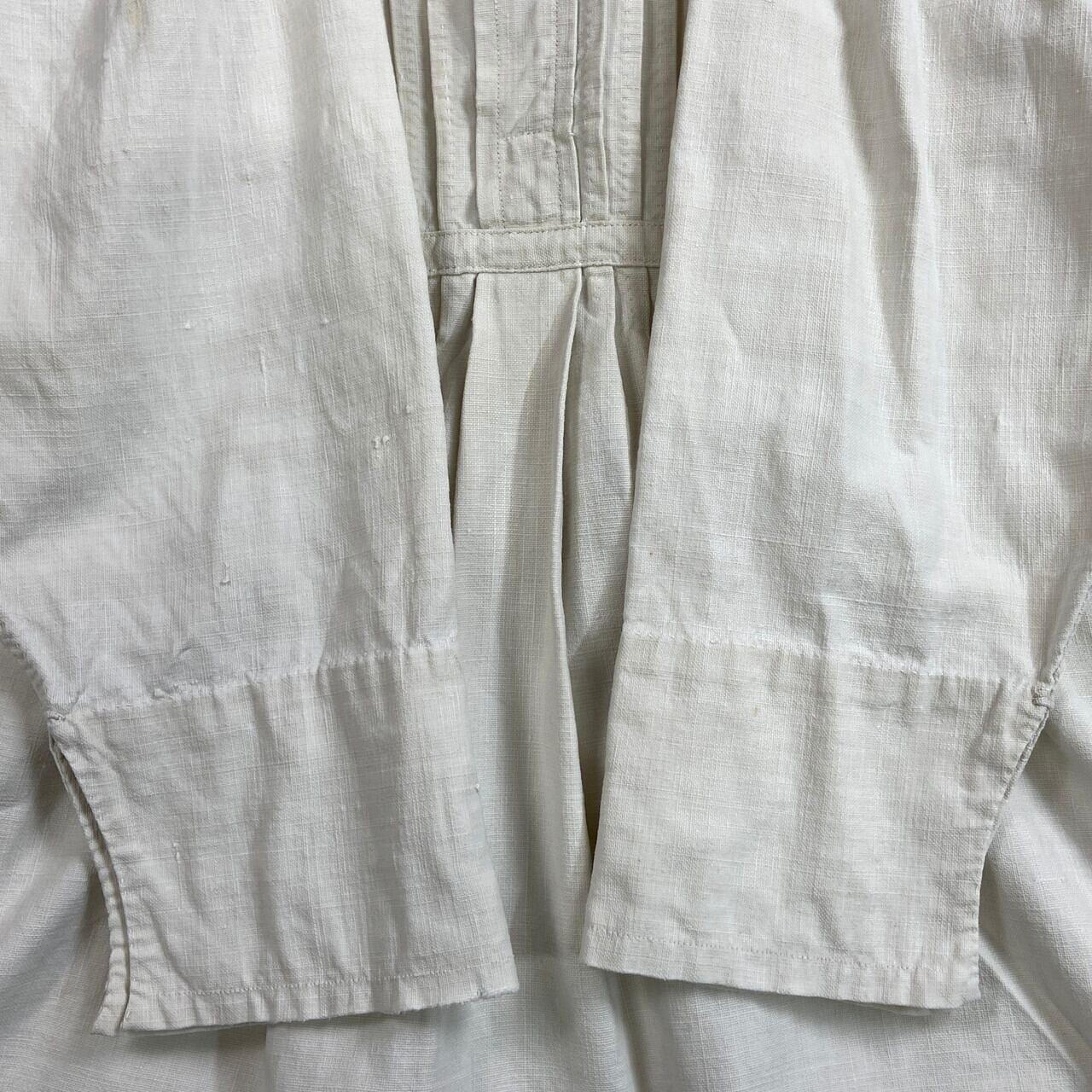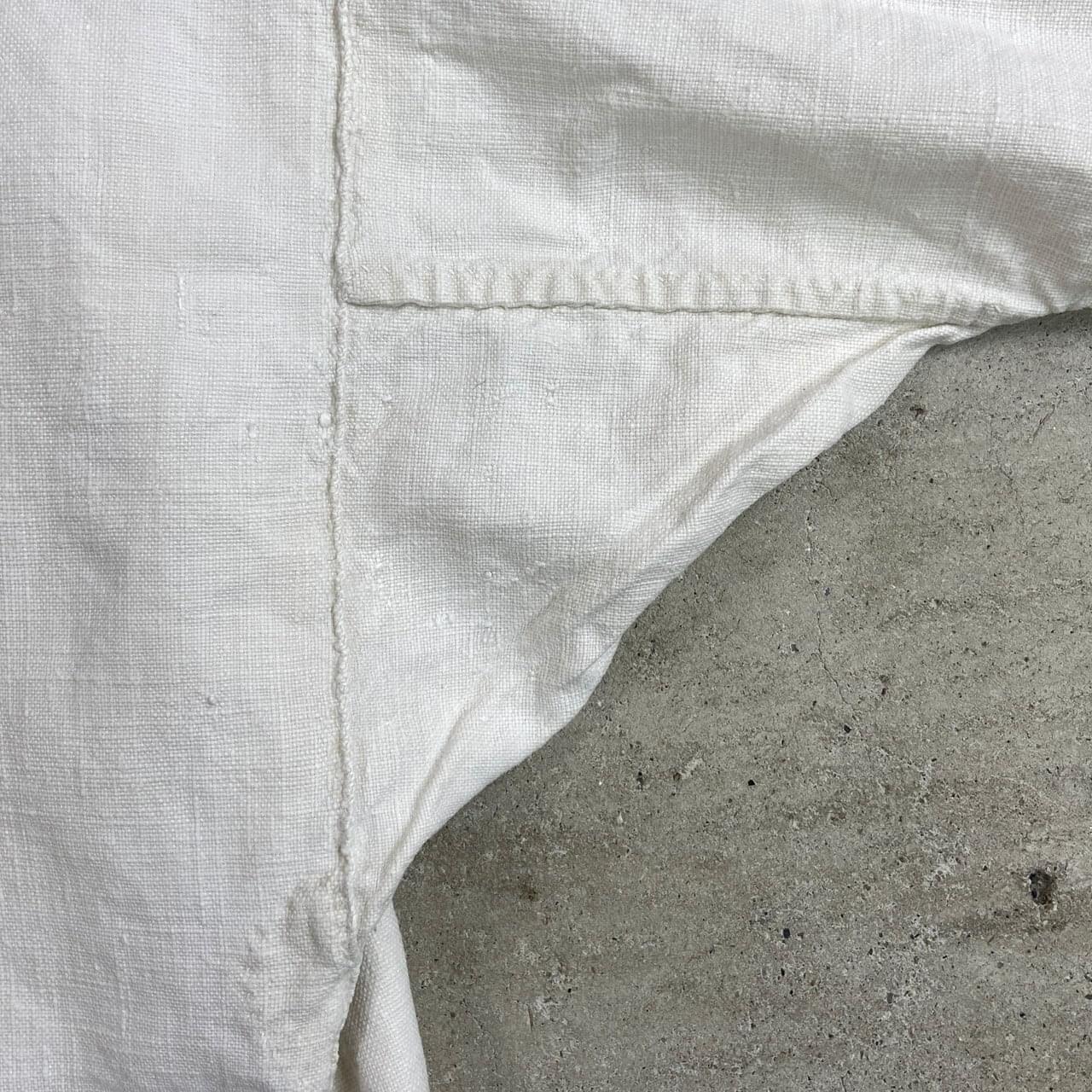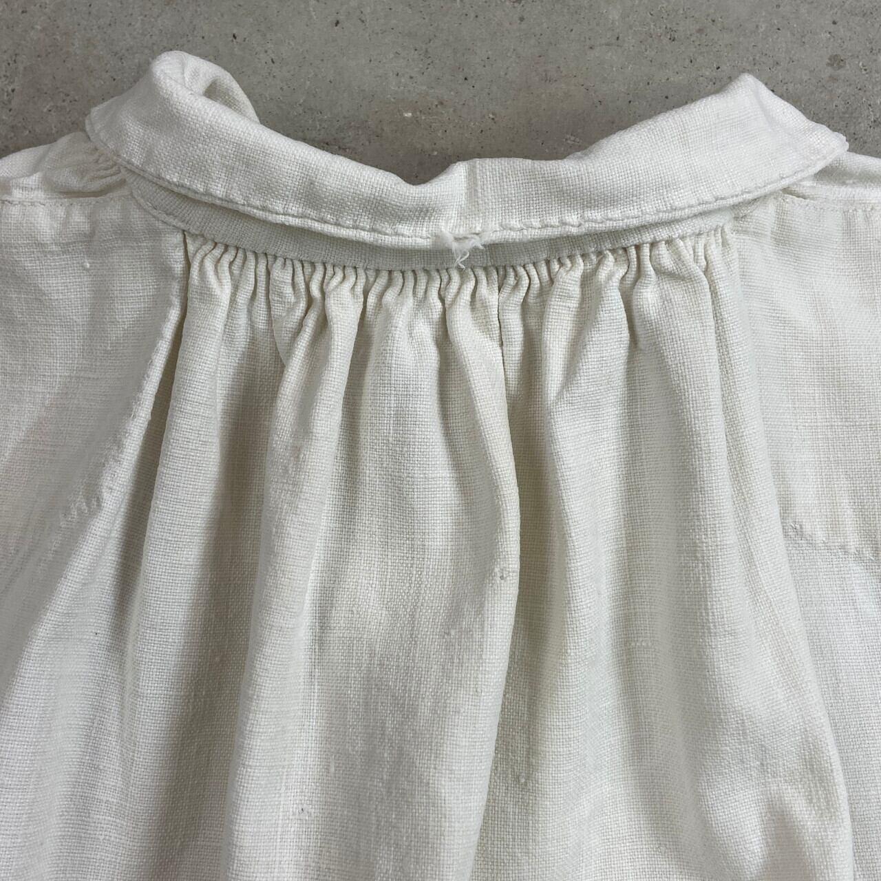 ■1900年代初頭 アンティーク リネンスモック ワンピース レディースL-XL相当 古着 VINTAGE ユーロヴィンテージ ナイトドレス グランパシャツ フランスアンティーク 白色【ブラウス】/ホワイト 1900年代初頭にフランスの農夫が作業着として愛用していた本物のアンティーク・リネンスモック(ファーマーズスモック)です。現代の多くのブランドがサンプリングする「元ネタ」そのものであり、歴史的な資料価値も非常に高い一着です。 当時のアンティーク品はタイトな作りが多い中、こちらは肩幅54cmという大変希少な大判サイズです。 現代のドロップショルダーとして理想的なシルエットで、レディースのL~XLサイズ相当としてゆったりとご着用いただけます。 【サイズ】(着用感レディースL-XL相当) ※計測値をご確認ください。 着丈…95 肩幅…54 身幅…54 袖丈…45.5 【生産国】フランスまたはフランス圏内(推定) 【素材】リネンのような風合いの生地 【状態】約100年前のアンティーク品としては、非常に良好な状態を保っています。 目立つ大きなダメージや汚れは見当たりませんが、アンティーク特有の細かなスレや、経年による風合いの変化はございます。 【c260221152】 ※古着は洗濯、検品などのケアを行っております。(新品・デッドストックは洗濯していません。) ※モニターの発色により実物と異なる場合がございます。予めご了承ください。 ※ 海外直輸入USED品になります。
