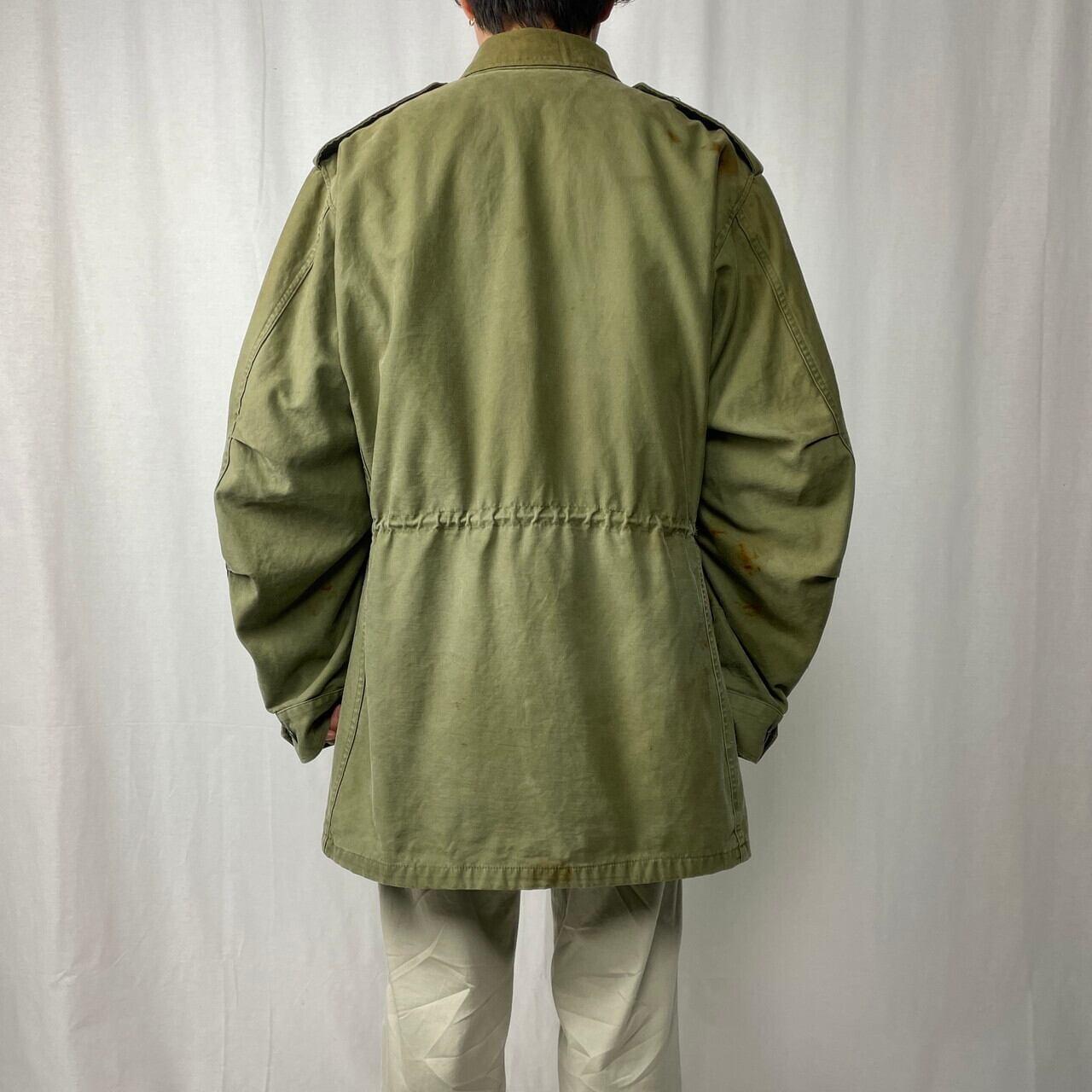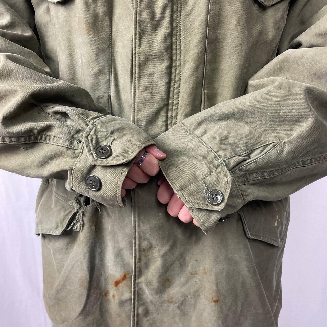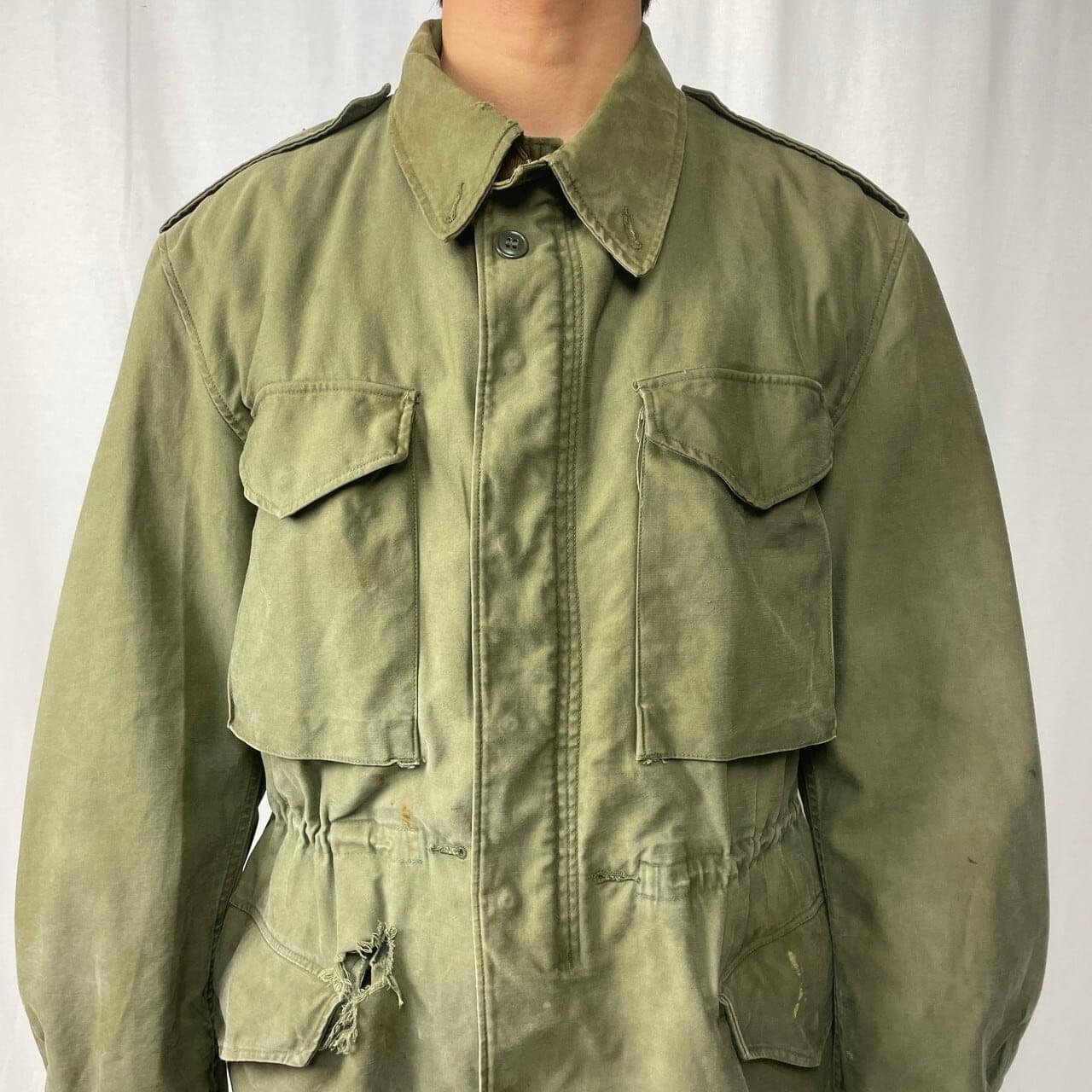 ■50年代 U.S.ARMY 米軍実品 M-51 ミリタリー フィールドジャケット メンズXL相当 古着 50s M-1951 ヴィンテージ VINTAGE オリーブグリーン【ミリタリージャケット】/カーキグリーン 【サイズ】表記 Long Medium(着用感メンズXL相当) モデル身長172cm ※計測値をご確認ください。 着丈…84 身幅…63.5 肩幅…53 袖丈…65 【生産国】USA製 【素材】不明 おそらくコットンかと思われます。 【状態】 全体的に色あせ、シミ汚れ、錆び汚れ、ダメージが御座います。 裏地にもダメージが御座います。 ジップが破損しているので開閉ができません。 画像にてご確認ください。 【c260119005】 ※古着は洗濯、検品などのケアを行っております。(新品・デッドストックは洗濯していません。)