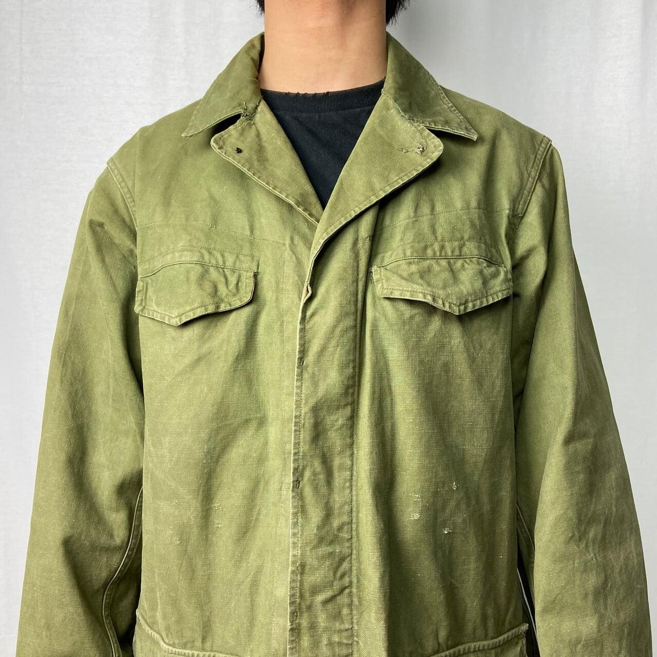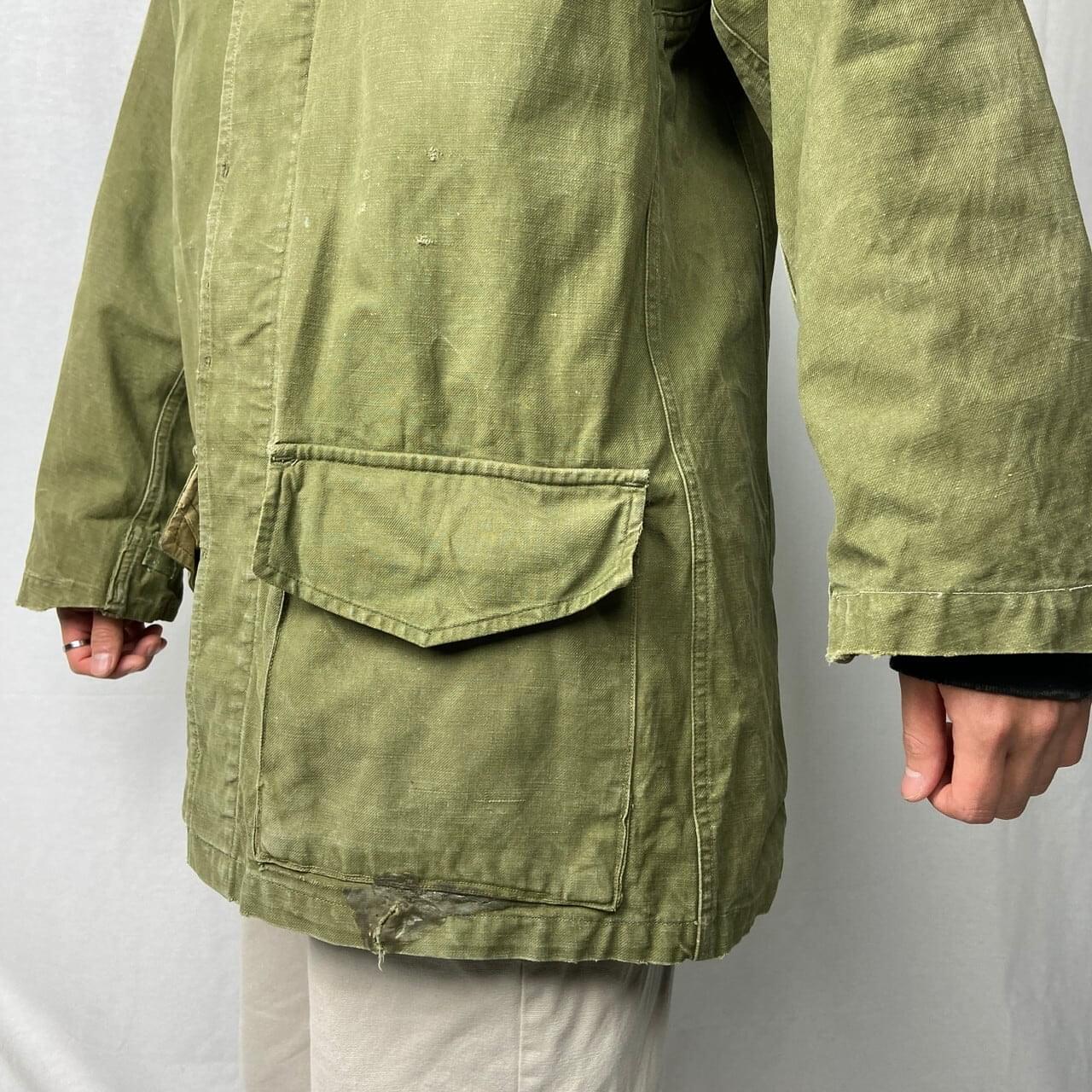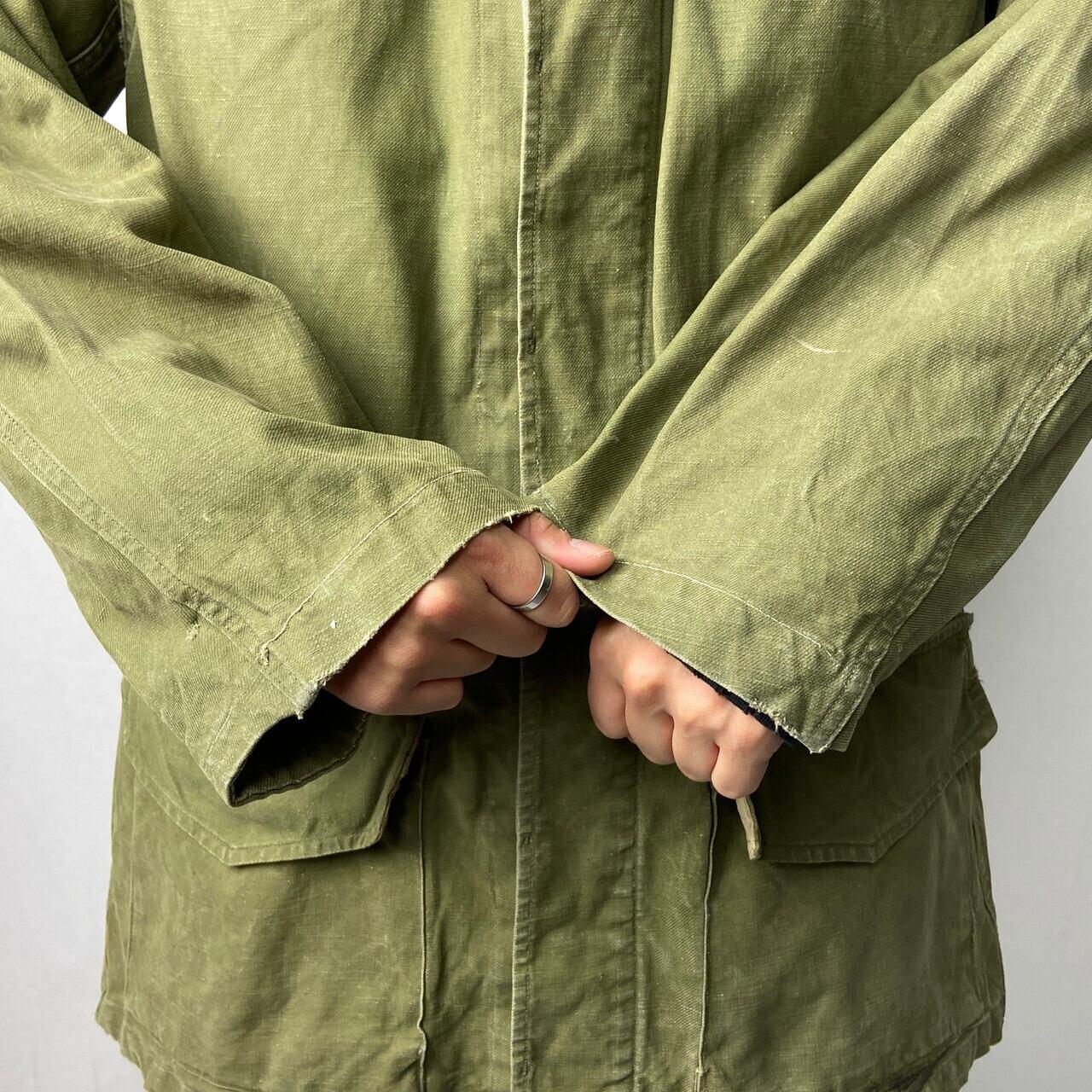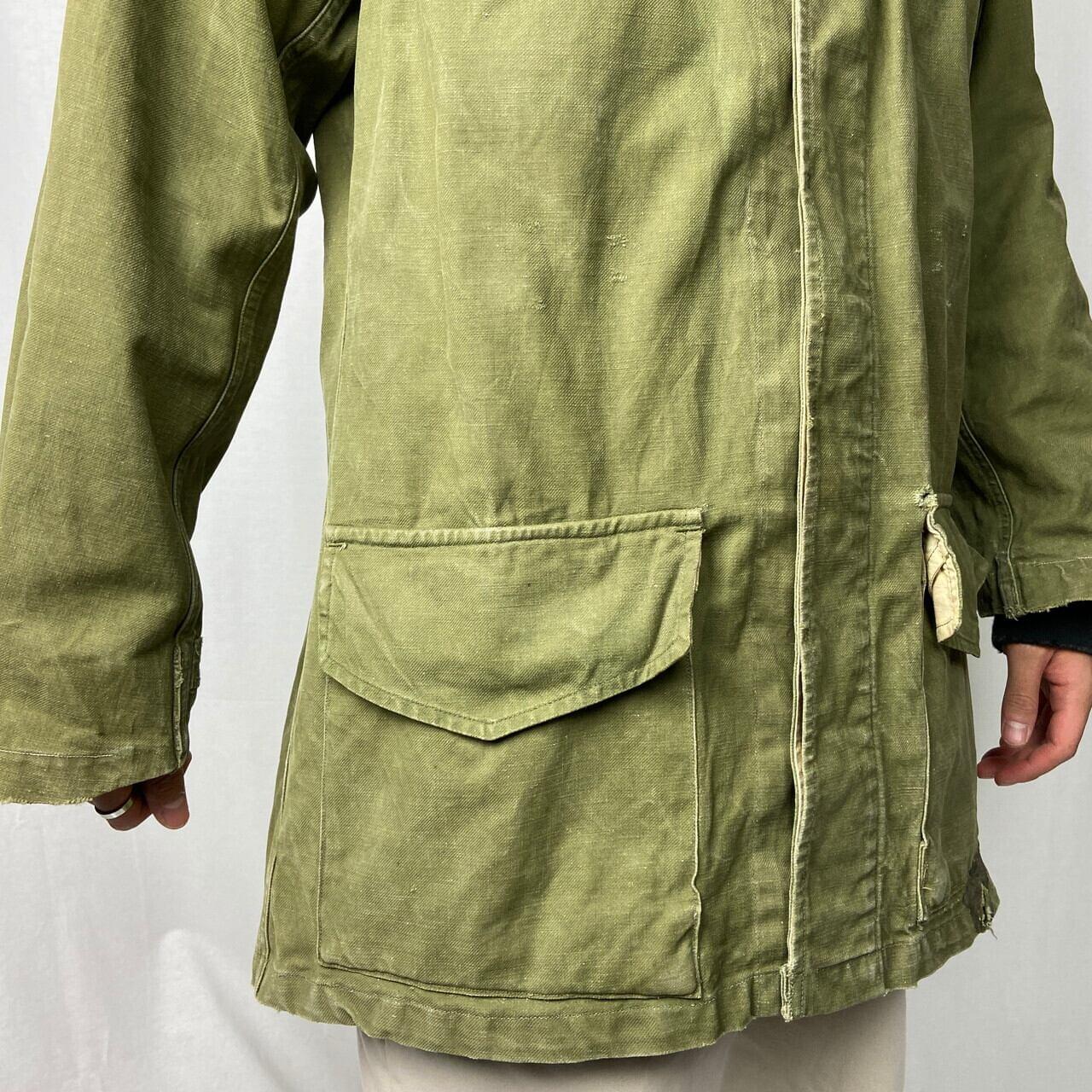 ■50年代 フランス軍 M-47 前期型 モディファイ フィールドジャケット メンズL相当 古着 50s ヴィンテージ VINTAGE ユーロミリタリー カスタム【ミリタリージャケット】/カーキグリーン ◎50年代 フランス軍、M-47フィールドジャケット 人気のM-47カーゴパンツとセットのジャケット こちらは襟元のフラップや袖のアジェスター、ウエストのドローコードなどが排除されており、ボタンも交換、随所にリペアありとかなり手が加えられたコンディション 生地の荒っぽい雰囲気とマッチしたジャンクな雰囲気な一着です 【サイズ】表記 46(着用感メンズL相当) モデル身長172cm ※計測値をご確認ください。 着丈…81.5 身幅…61.5 肩幅…50 袖丈…右59.5 左56 袖が丈詰めされており左右で長さが違っています。 【生産国】不明 【素材】不明(おそらくコットンかと思われます。) 【状態】全体的にカスタムやリペア、擦り切れや汚れ、右胸ポケットボタンホールパーツ欠損、左ポケットに接着剤付着等の使用感がございます。 画像にてご確認ください。 【c260119003】 ※古着は洗濯、検品などのケアを行っております。(新品・デッドストックは洗濯していません。) ※モニターの発色により実物と異なる場合がございます。予めご了承ください。 ※ 海外直輸入USED品になります。