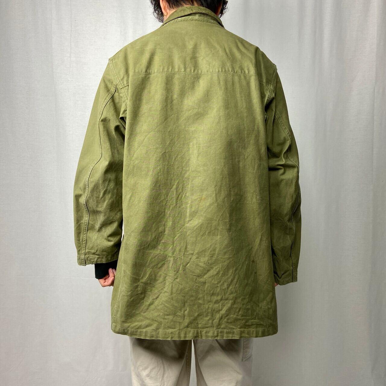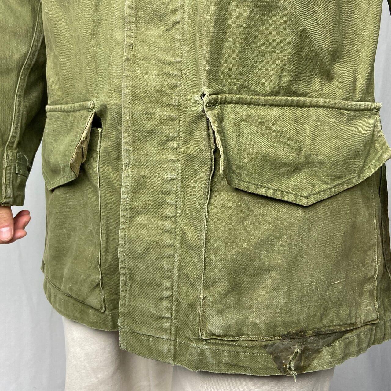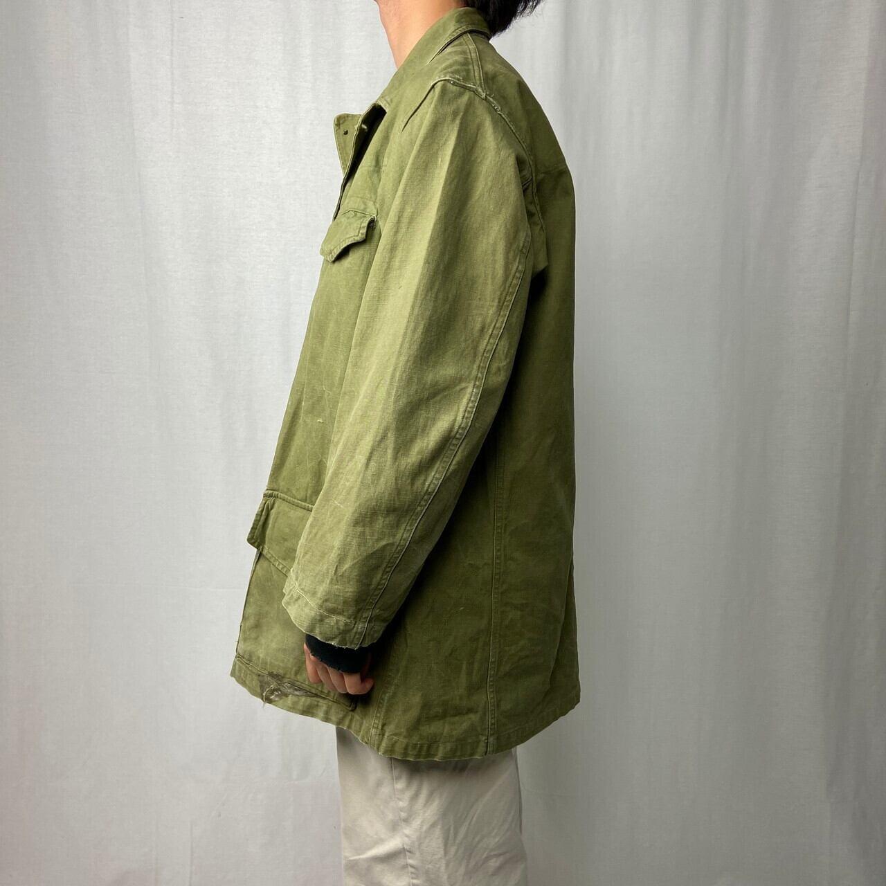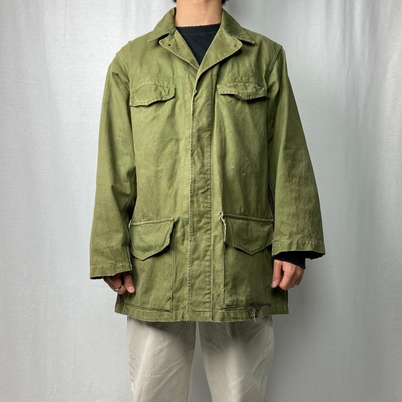 ■50年代 フランス軍 M-47 前期型 モディファイ フィールドジャケット メンズL相当 古着 50s ヴィンテージ VINTAGE ユーロミリタリー カスタム【ミリタリージャケット】/カーキグリーン ◎50年代 フランス軍、M-47フィールドジャケット 人気のM-47カーゴパンツとセットのジャケット こちらは襟元のフラップや袖のアジェスター、ウエストのドローコードなどが排除されており、ボタンも交換、随所にリペアありとかなり手が加えられたコンディション 生地の荒っぽい雰囲気とマッチしたジャンクな雰囲気な一着です 【サイズ】表記 46(着用感メンズL相当) モデル身長172cm ※計測値をご確認ください。 着丈…81.5 身幅…61.5 肩幅…50 袖丈…右59.5 左56 袖が丈詰めされており左右で長さが違っています。 【生産国】不明 【素材】不明(おそらくコットンかと思われます。) 【状態】全体的にカスタムやリペア、擦り切れや汚れ、右胸ポケットボタンホールパーツ欠損、左ポケットに接着剤付着等の使用感がございます。 画像にてご確認ください。 【c260119003】 ※古着は洗濯、検品などのケアを行っております。(新品・デッドストックは洗濯していません。) ※モニターの発色により実物と異なる場合がございます。予めご了承ください。 ※ 海外直輸入USED品になります。