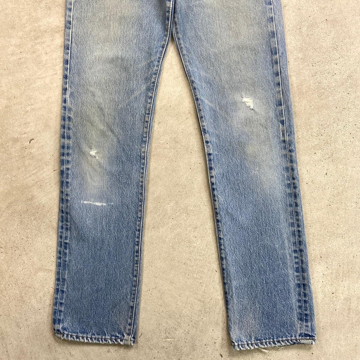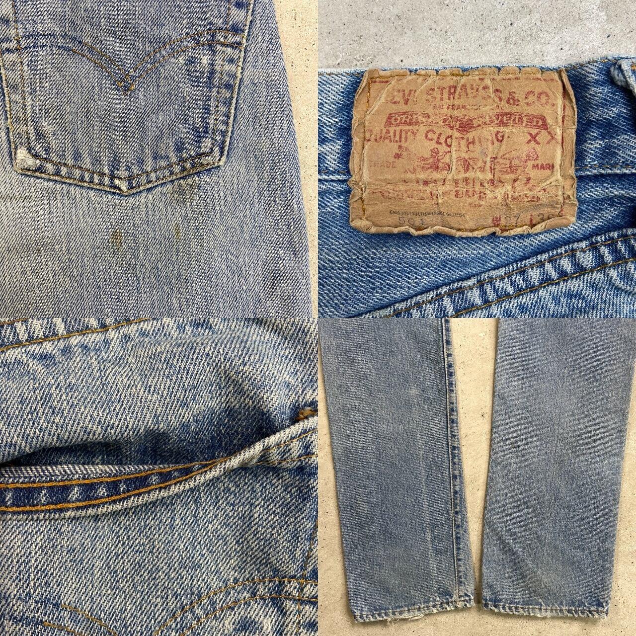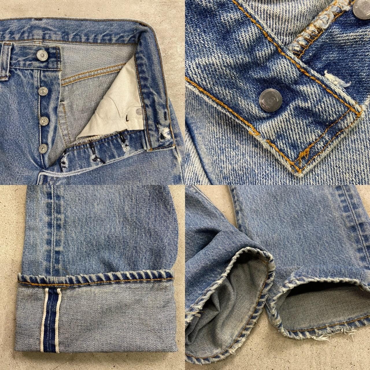 ■80年代 USA製 Levi's リーバイス 501 66後期 赤耳 移行期 ストレートデニムパンツ メンズW25相当 レディース 古着 80s ヴィンテージ VINTAGE アメカジ ジーンズ RED LINE レッドライン ポケット裏チェーンステッチ 黒カンヌキ アタリ ヒゲ 青色【デニムパンツ】/ブルー ◎こちらは1980年製のリーバイス501で、 工場番号が6番、ケアタグの収縮率が10%であることから、66後期から赤耳モデルになる過渡期になった個体です。 【ブランド】Levi's リーバイス ・トップボタン裏刻印 6 【サイズ】表記 W27 L36(実寸約W25 L32) ※裾上げされております ウエスト(平置き計測?2)…64 ワタリ幅...27 股上…26.5 股下…82 裾幅…18 【生産国】USA製 【素材】コットン100% 【状態】全体的に使用感による色あせがあり、薄っすらとヒゲがあります。 フロントひざにダメージや裾擦れがございます。 画像にてご確認ください。 【c260228127】 ※古着は洗濯、検品などのケアを行っております。(新品・デッドストックは洗濯していません。)