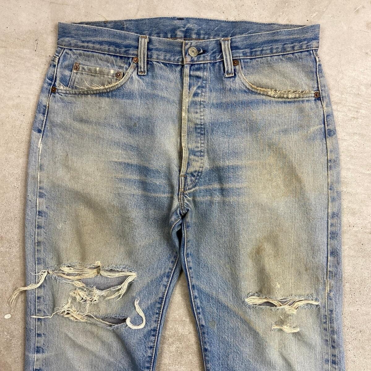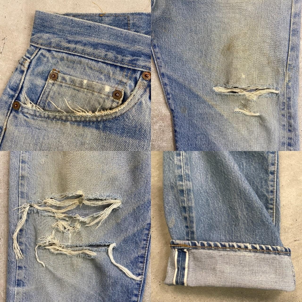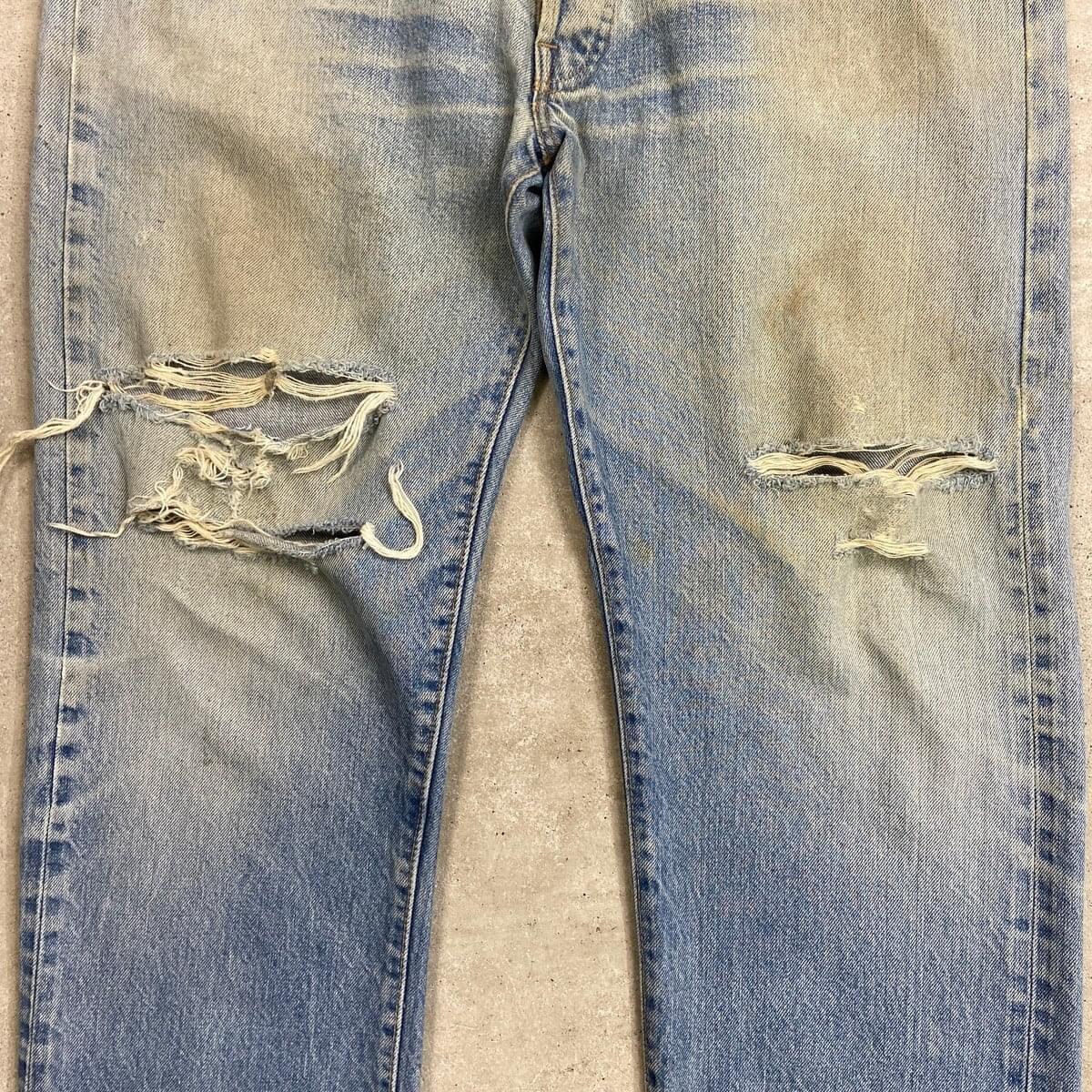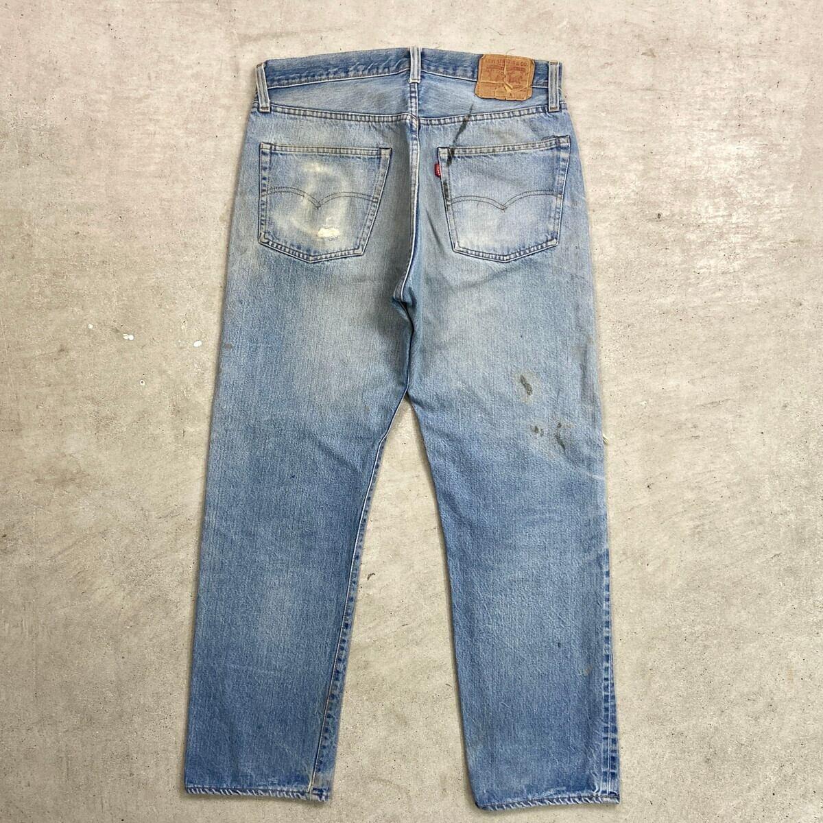 ■70年代 USA製 Levi's リーバイス 501 66後期 ストレート クラッシュデニムパンツ メンズW33相当 古着 70s ヴィンテージ VINTAGE アメカジ ジーンズ ポケット裏チェーンステッチ 黒カンヌキ アタリ ヒゲ 青色【デニムパンツ】/ブルー ◎こちらは1979年製のリーバイス501の66後期モデルになります。 【ブランド】Levi's リーバイス ・トップボタン裏刻印 6 【サイズ】表記 W36 L32(実寸約W33 L30) ウエスト(平置き計測?2)…83 ワタリ幅...33.5 股上…30.5 股下…75.5 裾幅…21 【生産国】USA製 【素材】コットン100% 【状態】全体的な色あせと膝のクラッシュがあり、 グランジスタイルを思わせるような雰囲気のある1本です。 バックサイドにもダメージや汚れがあります。 画像にてご確認ください。 【c260228126】 ※古着は洗濯、検品などのケアを行っております。(新品・デッドストックは洗濯していません。)