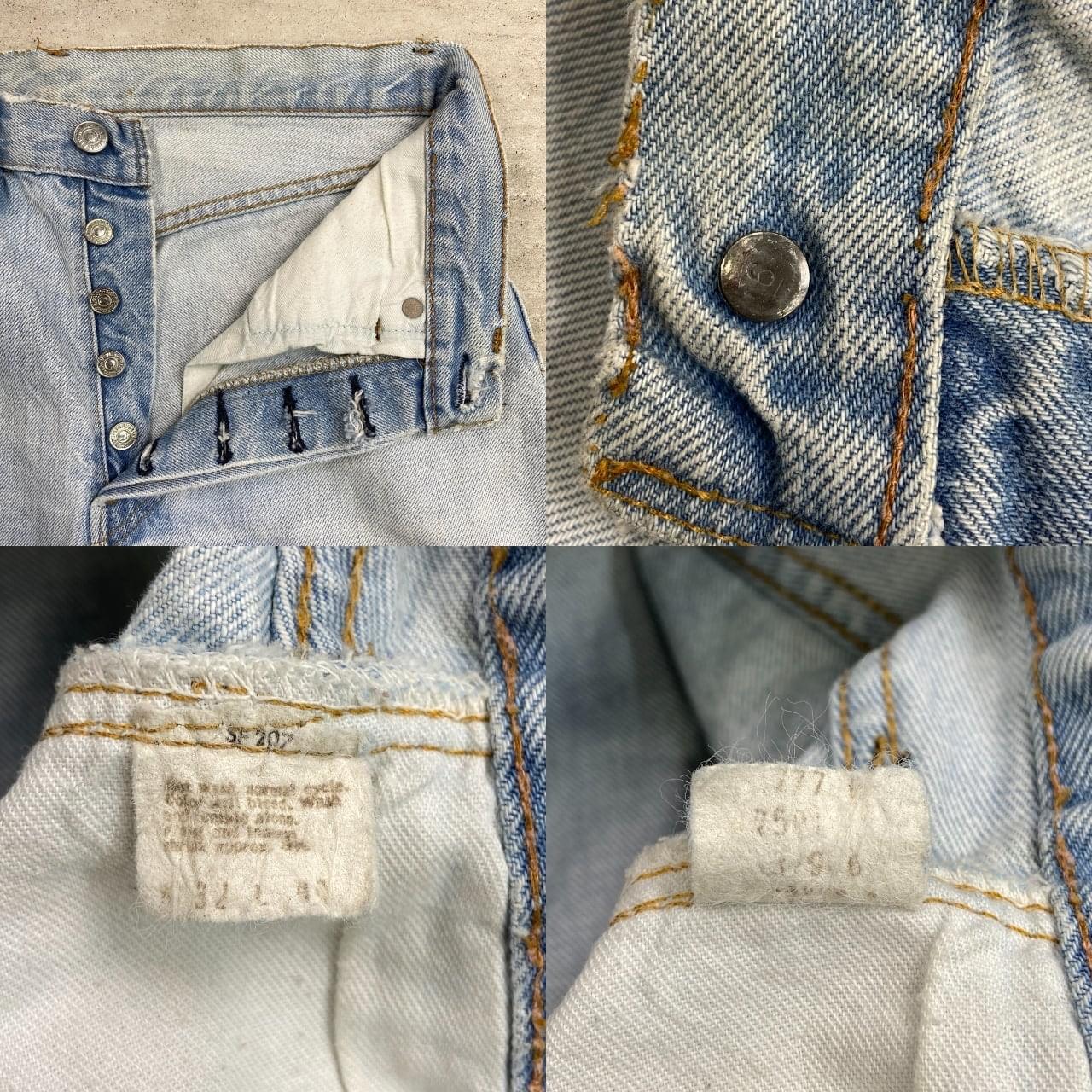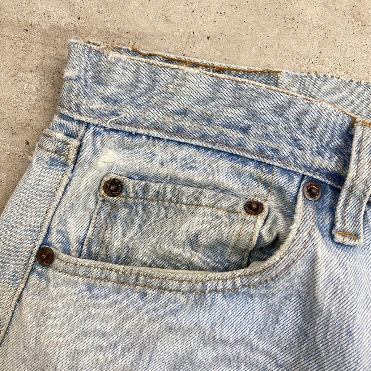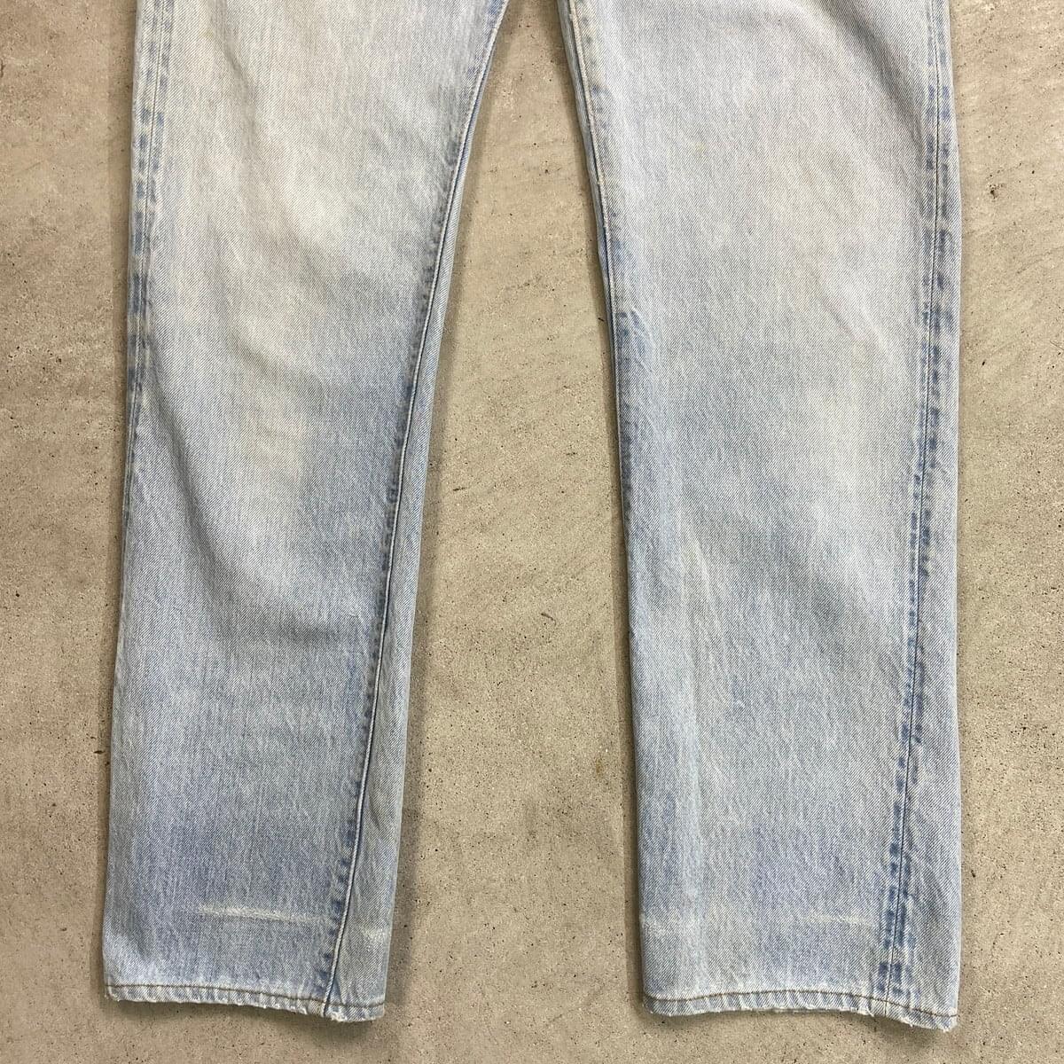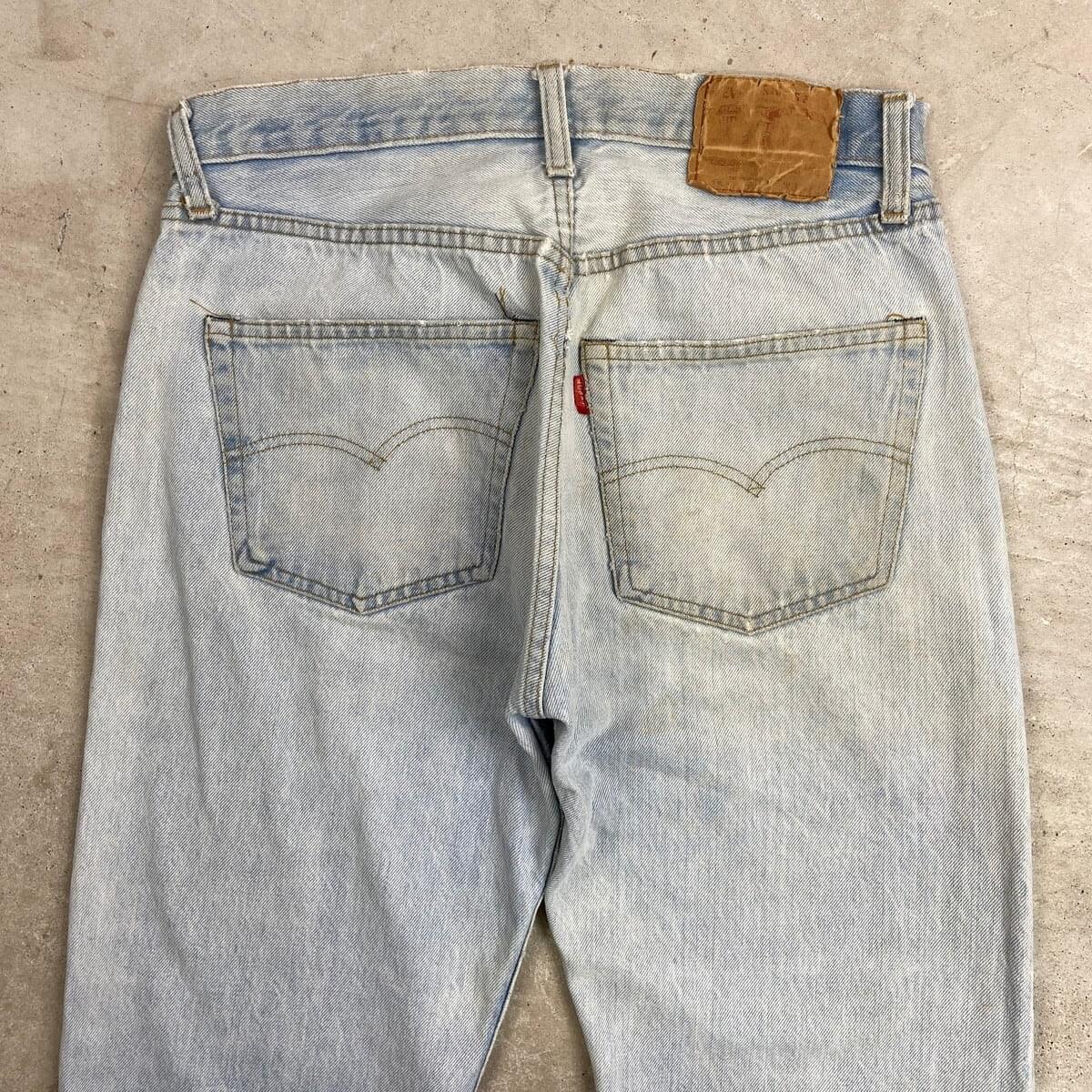 ■70年代 USA製 Levi's リーバイス 501 66後期 ストレート デニムパンツ メンズW30相当 古着 70s ヴィンテージ VINTAGE アメカジ ジーンズ ポケット裏チェーンステッチ 黒カンヌキ アイスブルー ライトインディゴ【デニムパンツ】/ライトブルー ◎こちらは1979年製のリーバイス501の66後期モデルになります。 【ブランド】Levi's リーバイス ・トップボタン裏刻印 6 【サイズ】表記 W32 L40(実寸約W30 L33) ※裾上げされております ウエスト(平置き計測?2)…77 ワタリ幅...31 股上…27.5 股下…83.5 裾幅…20.5 【生産国】USA製 【素材】コットン100% 【状態】ベルトループ、ポケット付近、裾などに擦れによる ダメージほつれがあります。 フロント腿付近、バックサイドに薄いシミ汚れがございます。 画像にてご確認ください。 【c260228124】 ※古着は洗濯、検品などのケアを行っております。(新品・デッドストックは洗濯していません。)