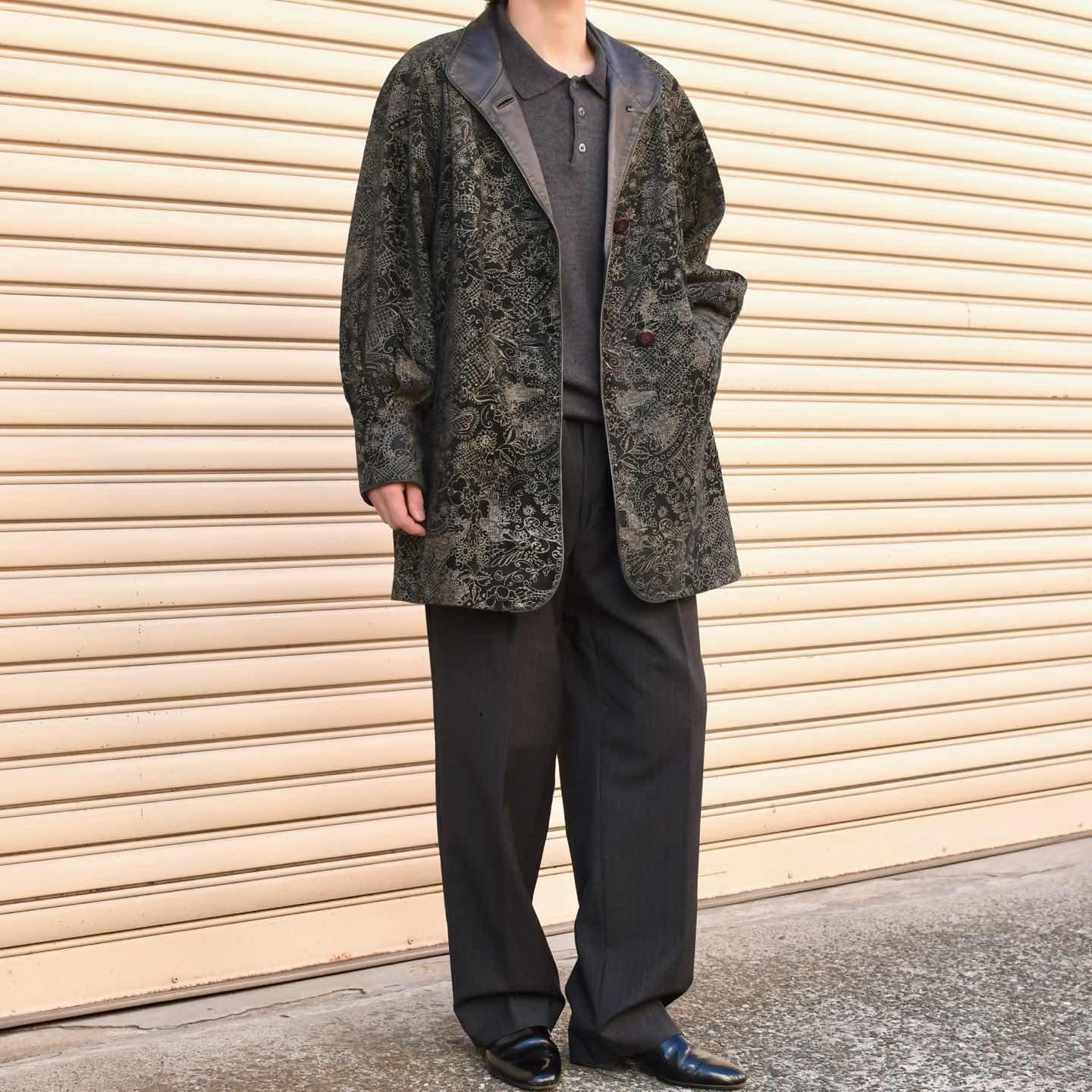 古着 レザー ハーフコート 総柄 花柄 プリント レザーコート ブラック